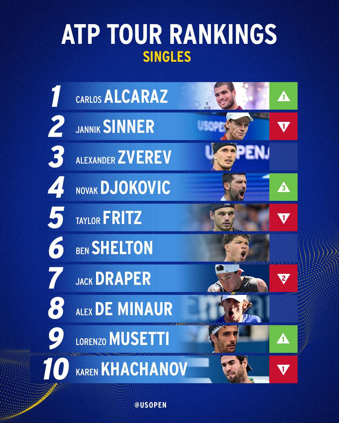 Покрај двајцата тенисери кои ги сменија своите места на АТП листата, на третото место сега за сега останува Александер Зверев, а огромен скок од три места има српскиот тениски ас Новак Ѓоковиќ кој сега е на четвртата позиција.