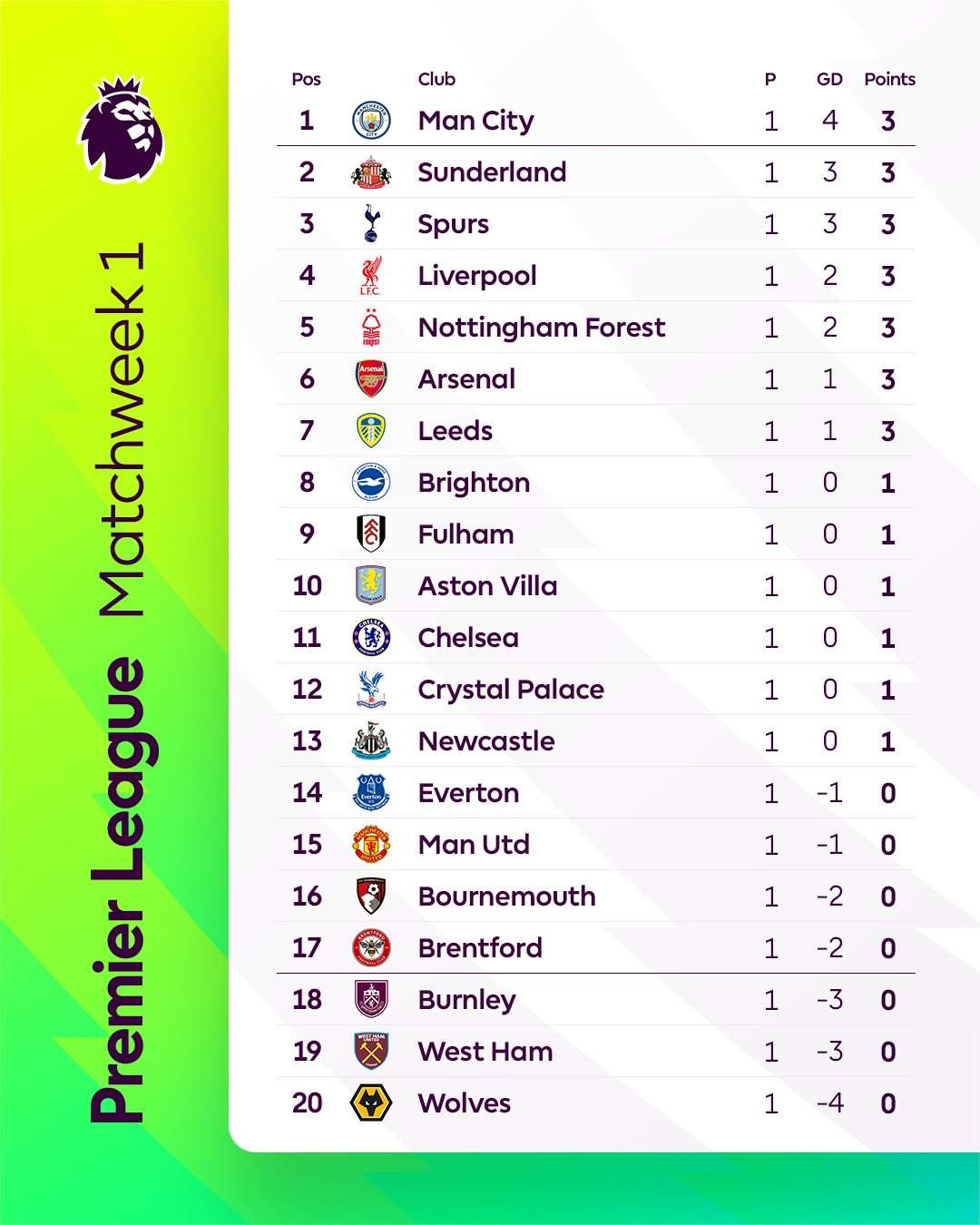Најдобри во викендот за отворање на сезоната беа Манчестер Сити, кои ги совладаа Вулвс со 4:0, а изненадувачки втори се повратниците во Лигата, Сандерленд, кои на натпреварот после осум години назад во првата лига, ги совладаа фаворизираните Вест Хем со дури 3:0.