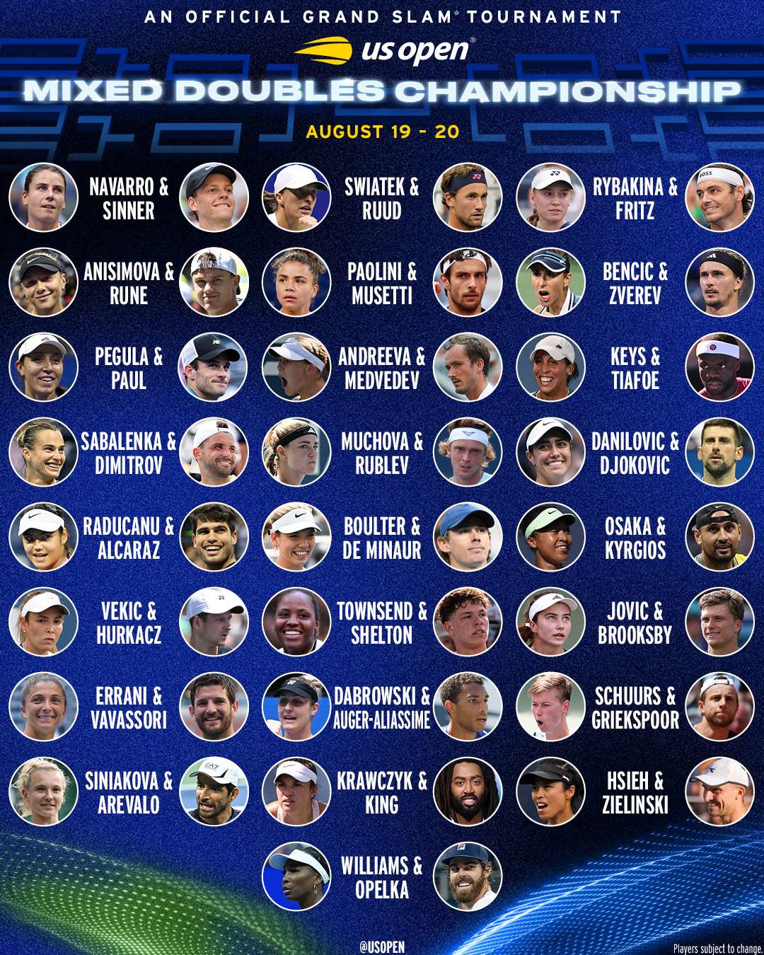 Оваа година УС Опен го сменија форматот за мешаните тениски двојки, а 25 двојки се пријавиле за натпреварувањето кое треба да се одигра на 19 и 20 август.