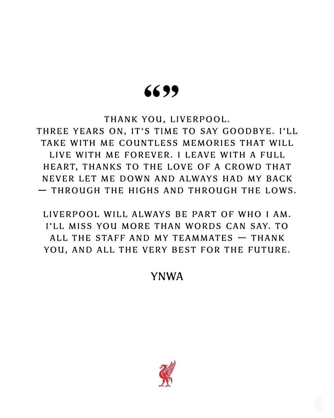 “Ливерпул секогаш ќе биде дел од она што сум. Ќе ми недостасува повеќе од што можам да кажам со зборови. На сите вработени и моите соиграчи – ви благодарам и ви посакувам само најдобро за иднината”, завршува писмото.