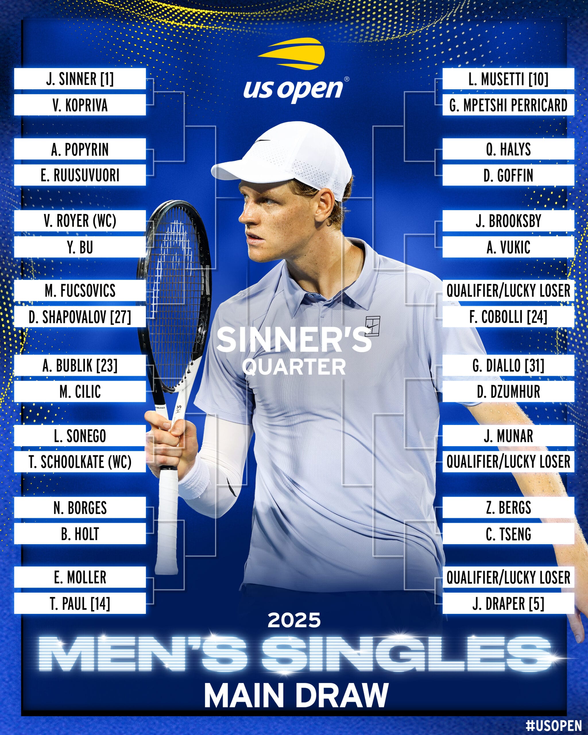 Од друга страна пак, Јаник Синер овој пат ќе има “полесен пат”, а турнирот ќе го стартува против Коприва. Домашниот миленик, Тејлор Фриц ќе игра против Нава, кој пристигна на турнирот со валјд-карта.