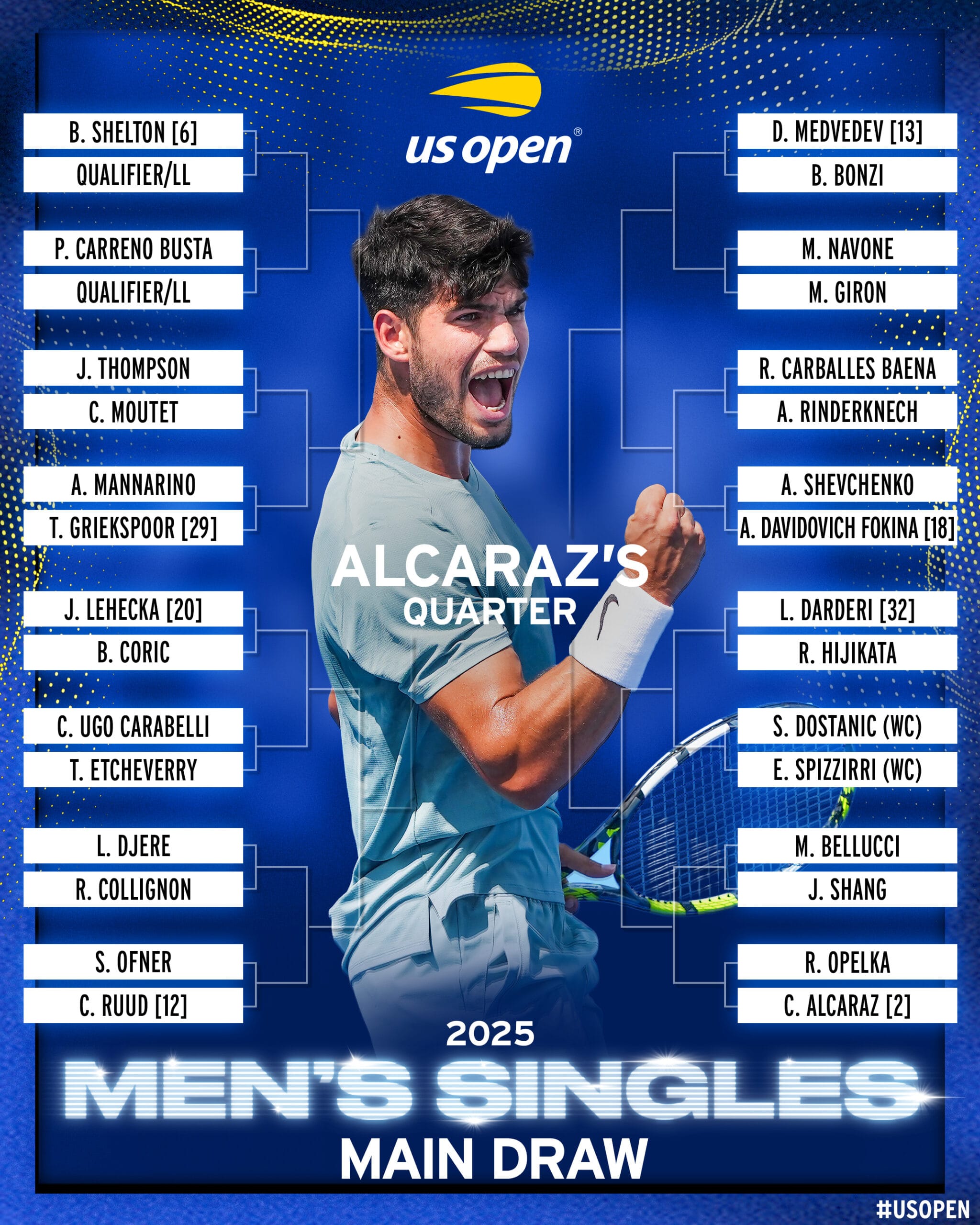 Ако Карлос Алкараз имаше вистинска среќа да има лесен пат на Вимблдон и Роланд Гарос, овој пат ќе се соочи со тежок противник уште во првата рунда, каде ќе игра со Опелка, а понатаму на патот би можел да се соочи со Медведев во четвртата рунда, со Шелтон или Руд во четвртфиналето и Ѓоковиќ или Фриц во полуфиналето на турнирот.