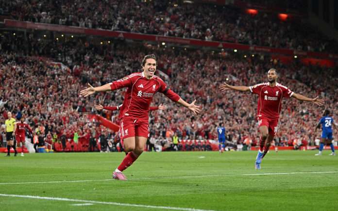 Честа да го постигне првиот гол во новата сезона му припадна на најновото засилување на Ливерпул, Иго Екитике. Во 37-та минута, по еден среќен, “билијард” одбиток, Французинот ја смести топката во мрежата за водство од 1:0. “Ова е како гол од EA FC 25”, “Го има бесот на Дарвин, но со свилена завршница”, беа само дел од коментарите на воодушевените фанови.